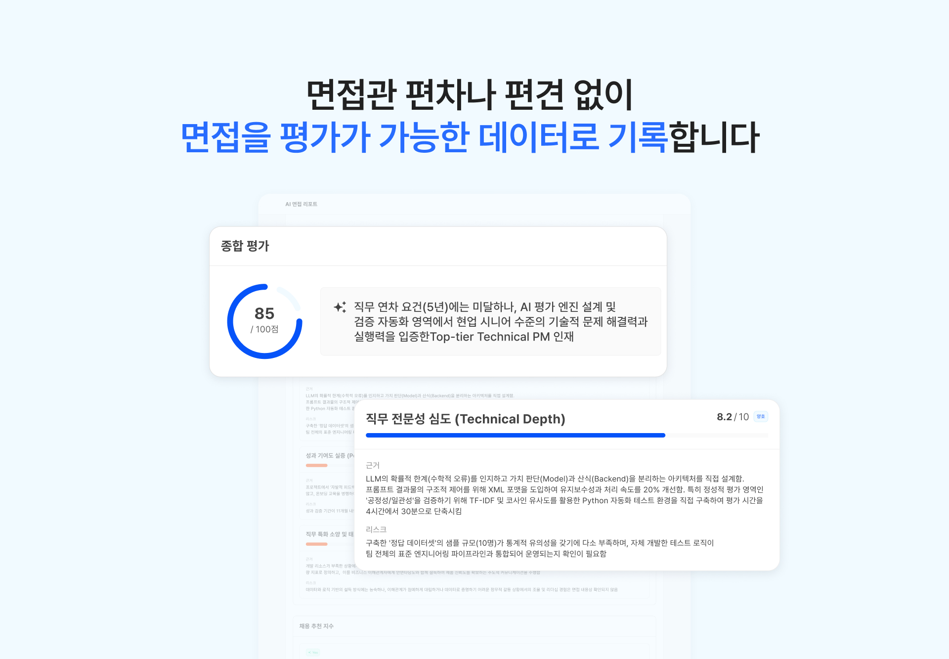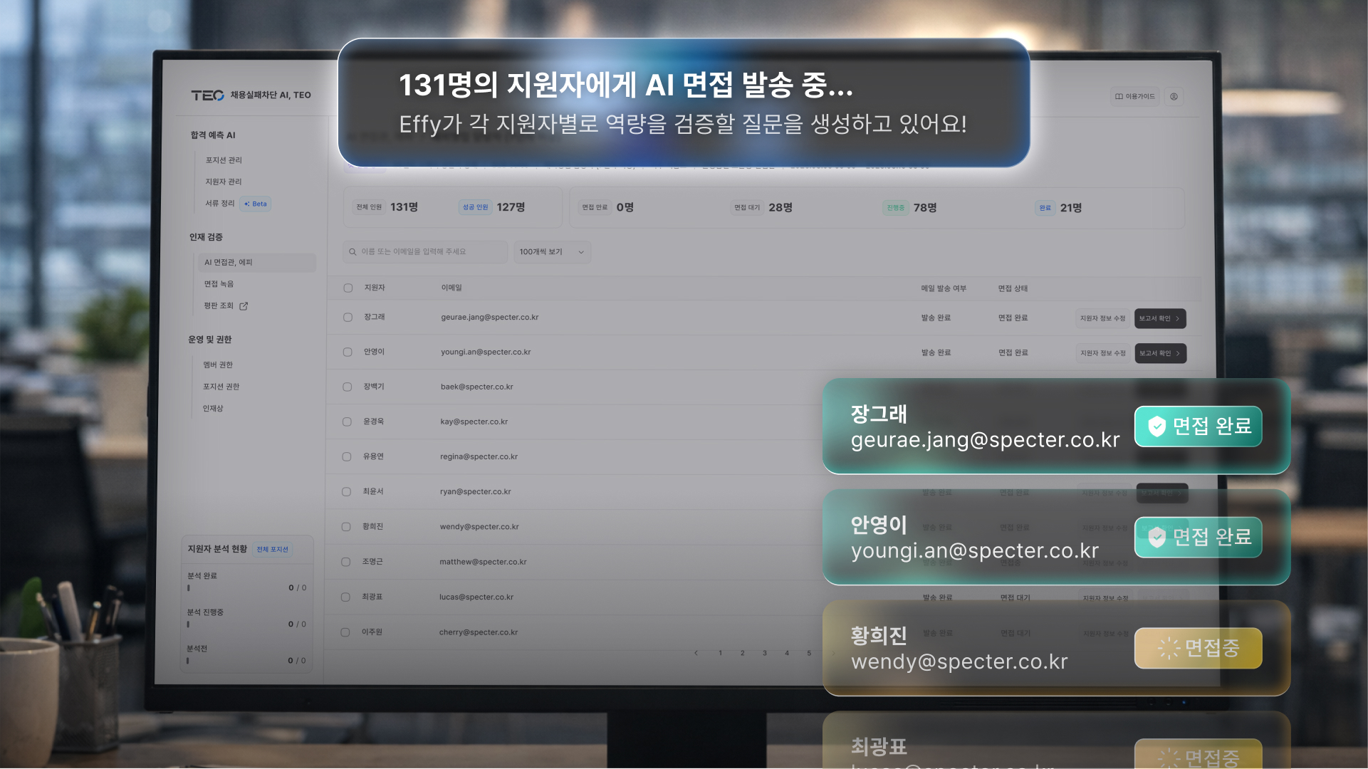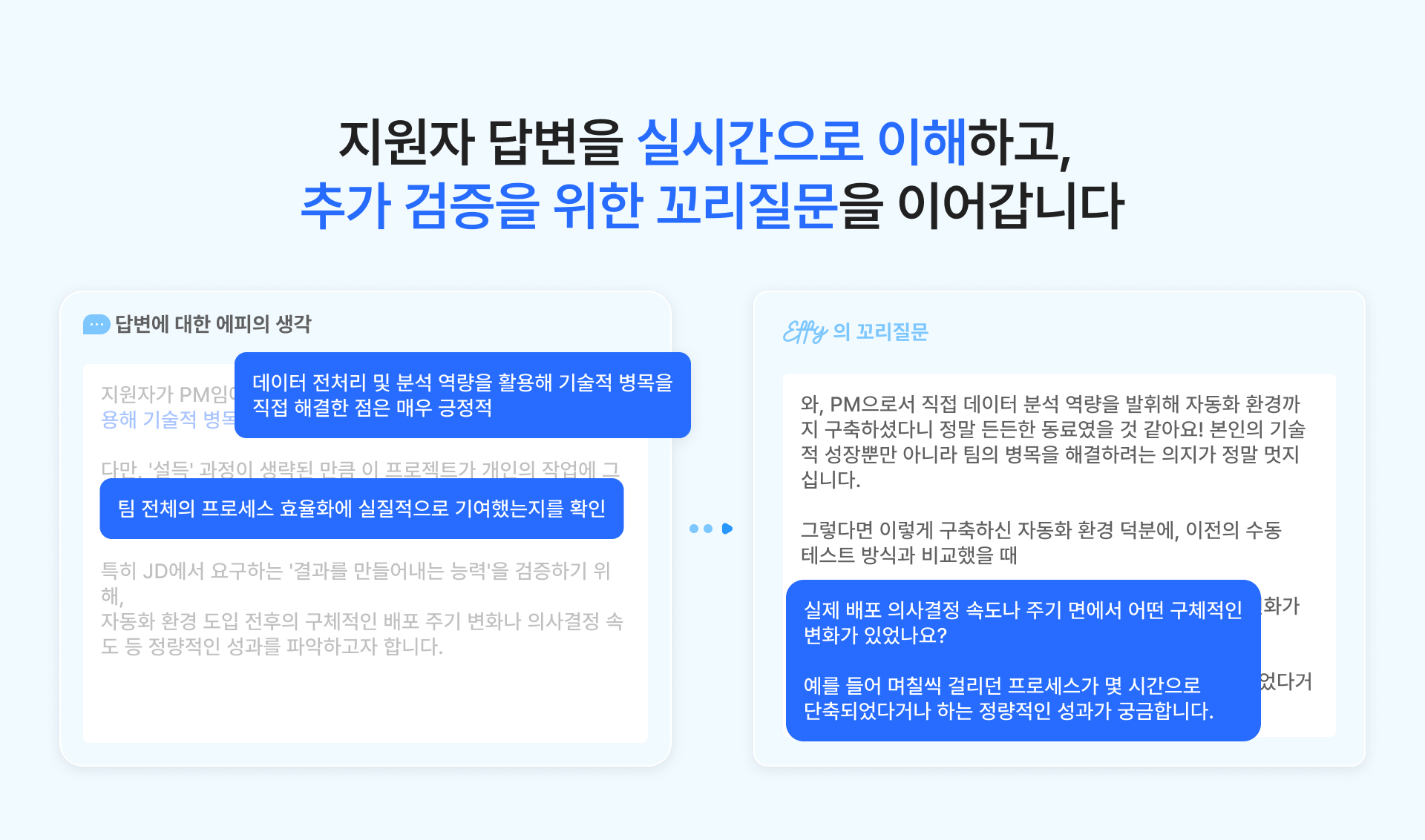 Effy(μνΌ)λ μ±μ©κ³΅κ³ (JD)μ μΈμ¬μ, μ§μμμ μ΄λ ₯μ κΈ°λ°μΌλ‘ μ§λ¬Έμ μ€κ³νκ³ , μλ₯ μ΄ν 첫 κ²μ¦μ λ λΉ λ₯΄κ² μμν μ μκ² λλ AI λ©΄μ κ΄μ